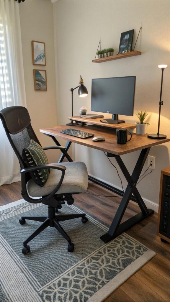 Add soft lighting with a table lamp or candles. Incorporate natural elements like stone or jute rugs for texture. A rustic office creates a relaxing and inviting atmosphere.